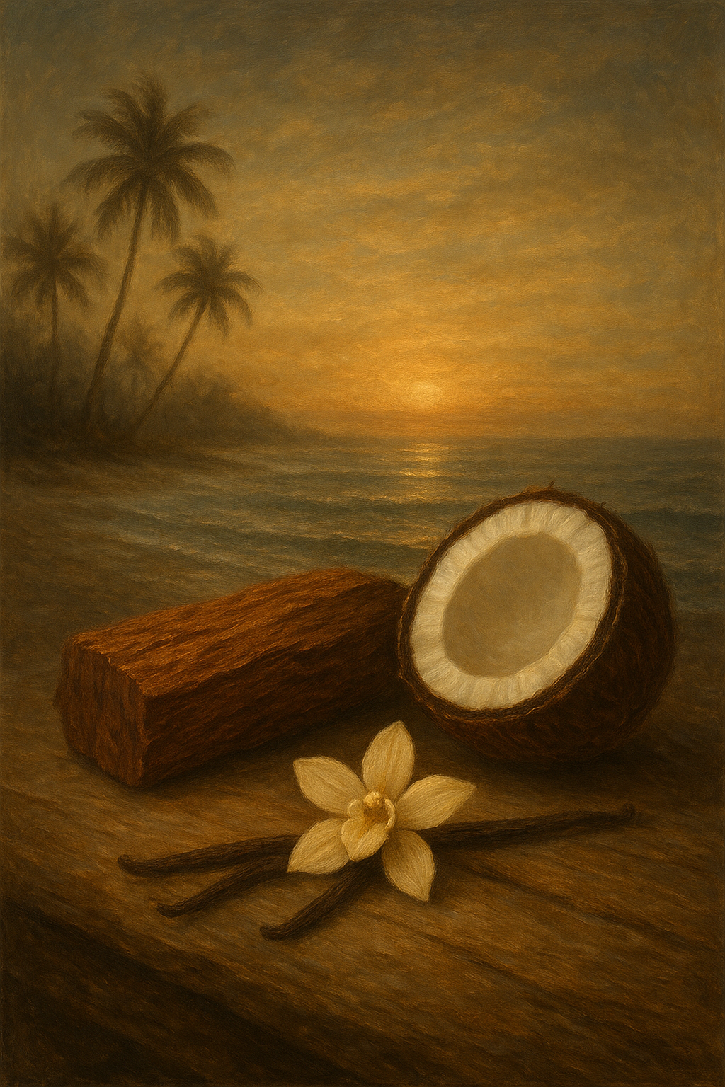 A scent of tranquil sophistication — like the stillness of dusk along a hidden island cove. Blending the grounding depth of polished mahogany with the creamy allure of coconut milk and soft vanilla woods.